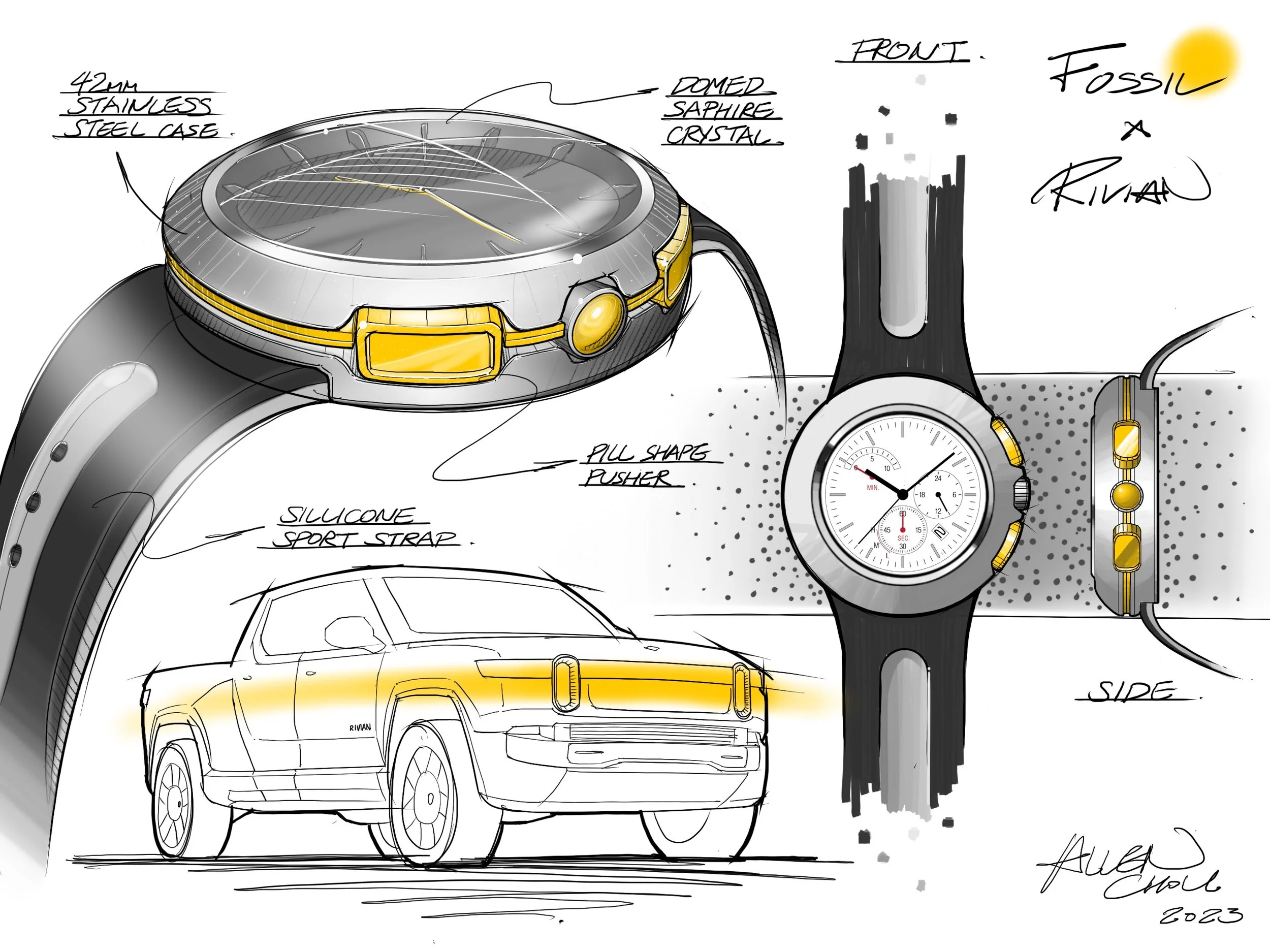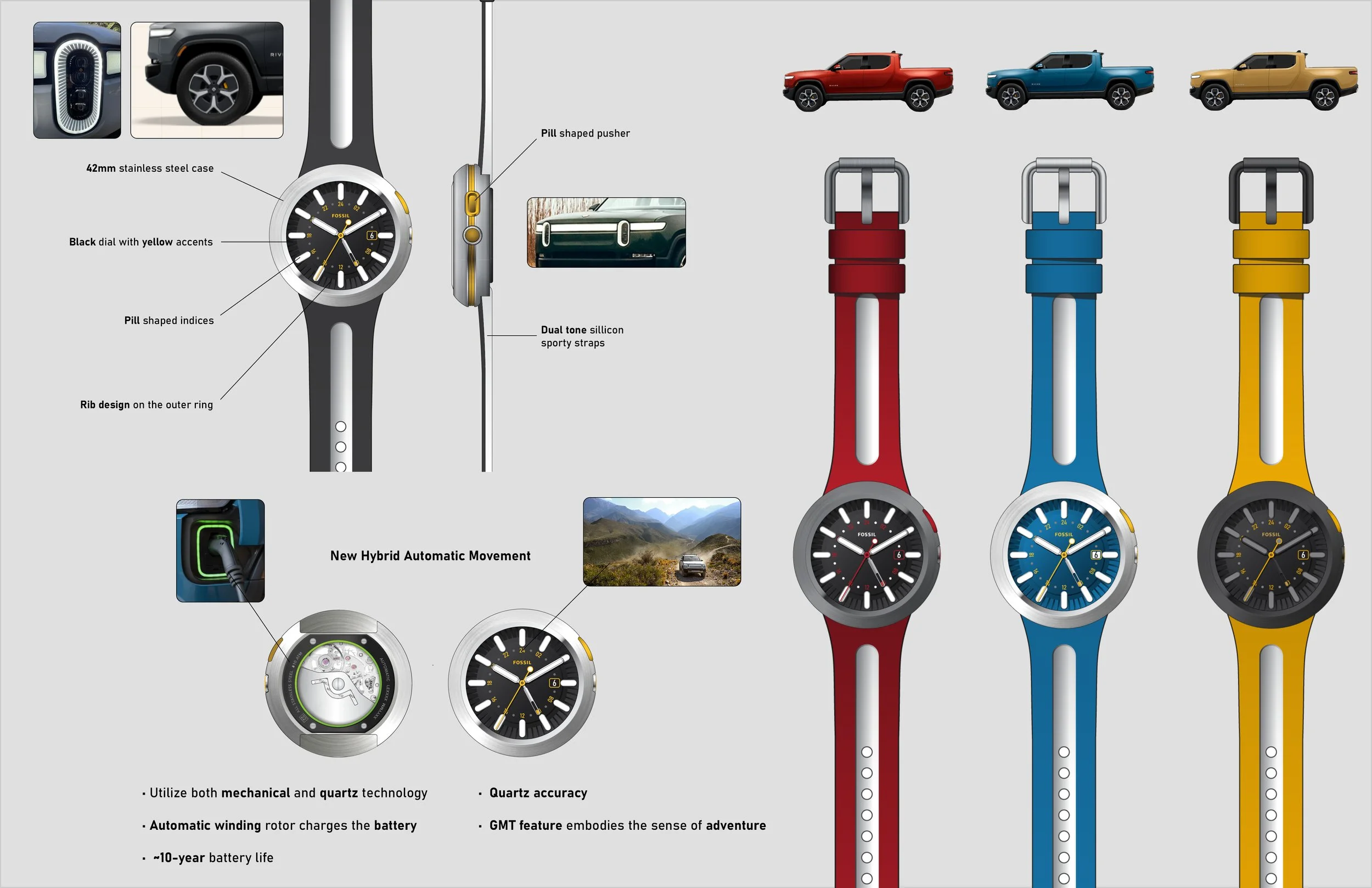Auto-inspired watches has always been a lucrative but competitive market. In order to differentiate ourselves, I wanted to design a watch that was inspired by modern, electric vehicles instead of traditional gasoline cars. Rivian was our natural choice when it came to collaboration.