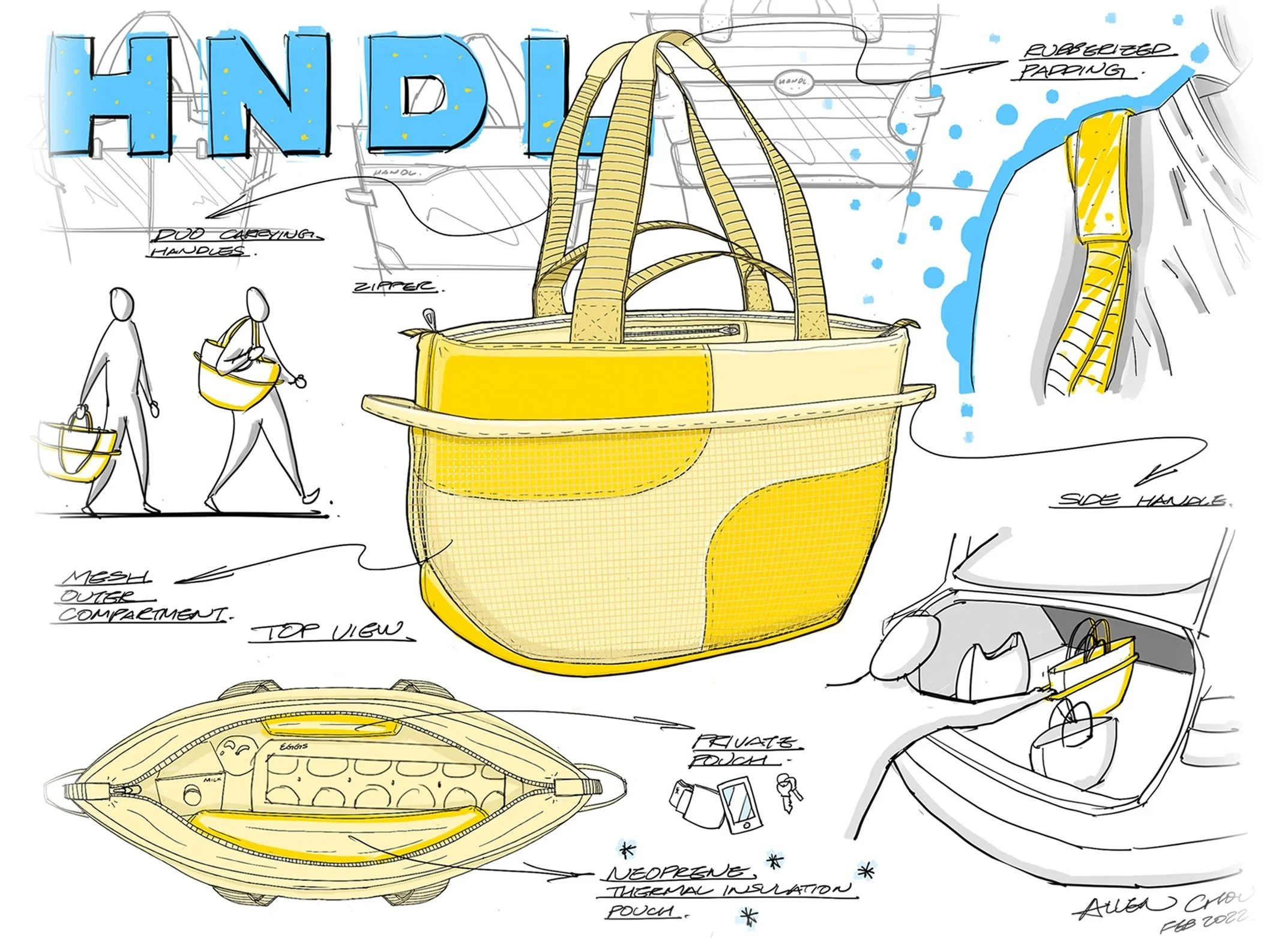 HNDL is a new kind of grocery bag that brings comfort and convenience to your weekly shopping trip. Features such as dual carrying straps and side handles give you more options to carry and maneuver your bag from different situations. The outer mesh compartment opens up more storage space for your groceries and is easy to access to. Keep your items hot or cold in the inner thermal insulating pouch. Express your personality with the “Lemonade” colorway and get a better handle on your groceries.